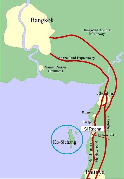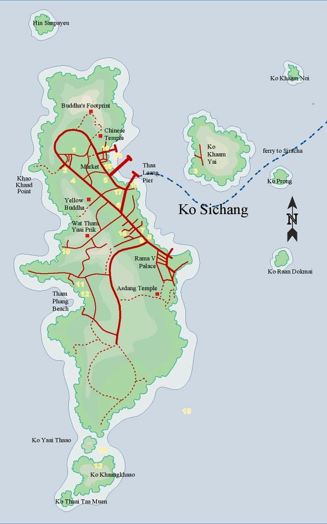 Koh Sichang ( เกาะสีชัง ) est une île située au large de Si Racha, (environ 25 km de chez nous, vers le Nord), accessible facilement et qui n'est pas (pas encore ?) victime du tourisme de masse. (Le ferry n'embarque pas les véhicules. Cela permet d'éviter l'envahissement de l'île par les bus de touristes...)