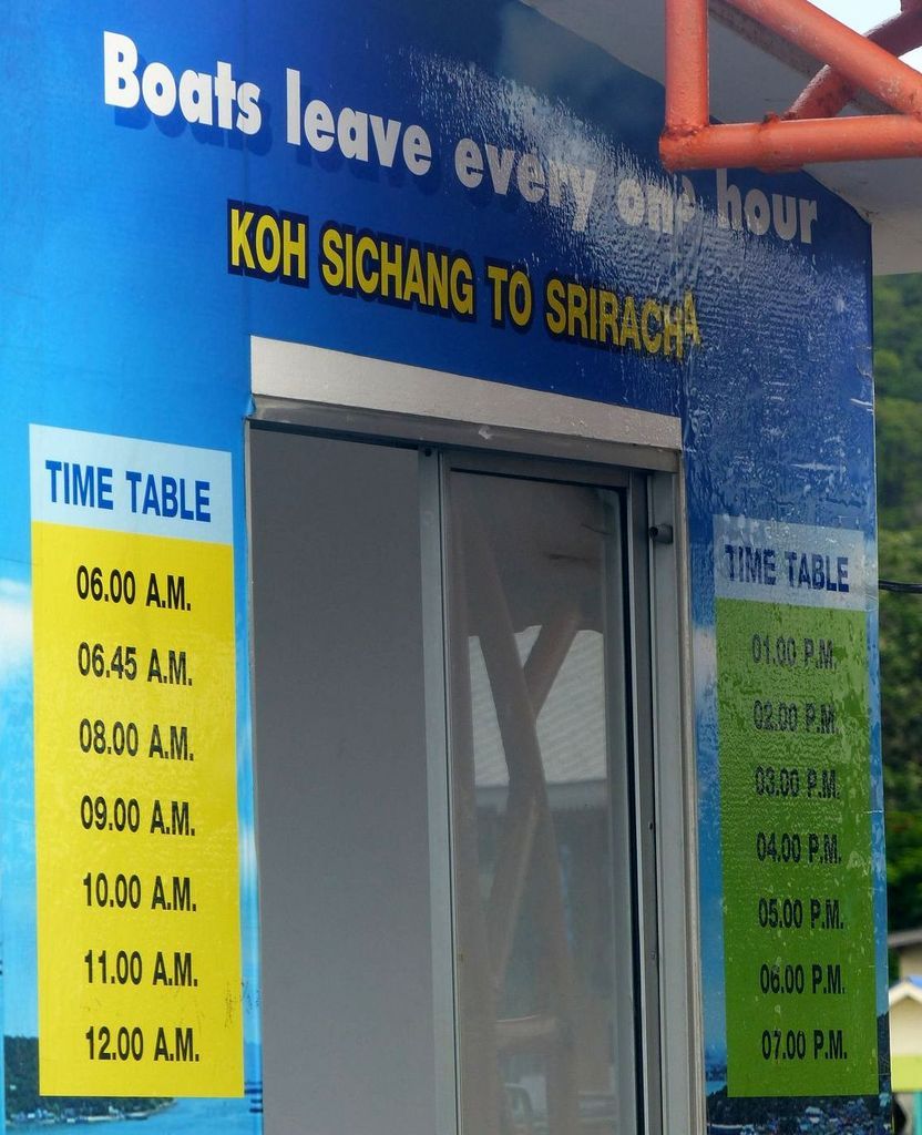 Il y a un bateau toutes les heures (la traversée dure environ 45mn) qui transporte à la fois les touristes et les locaux qui travaillent ou habitent sur l'île. Ainsi en fin d'après midi on peut voir les écoliers qui débarquent au retour de leur journée d'école à Si Racha.