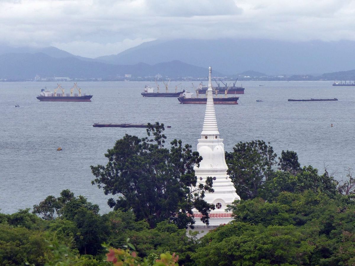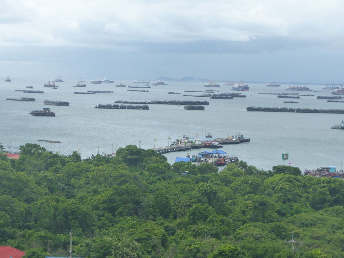 Ces cargos imposants viennent y stationner pour débarquer leurs cargaisons vers le complexe industriel de Laem Chabang, tout proche.