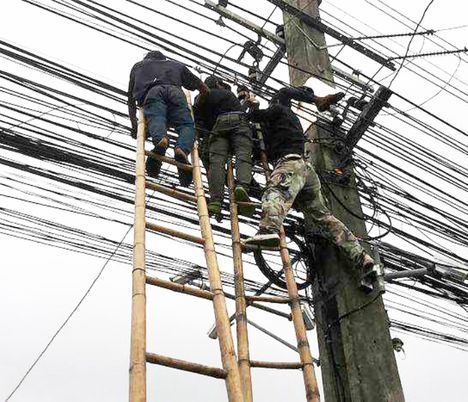 Il est fréquent de voir des ouvriers perchés sur des échelles, en train de les manipuler, en train d'en ajouter en les fixant sur des poteaux déjà surchargés... ! Difficile de savoir comment ils s'y retrouvent, encore moins de comprendre le besoin de ces ajouts permanents !