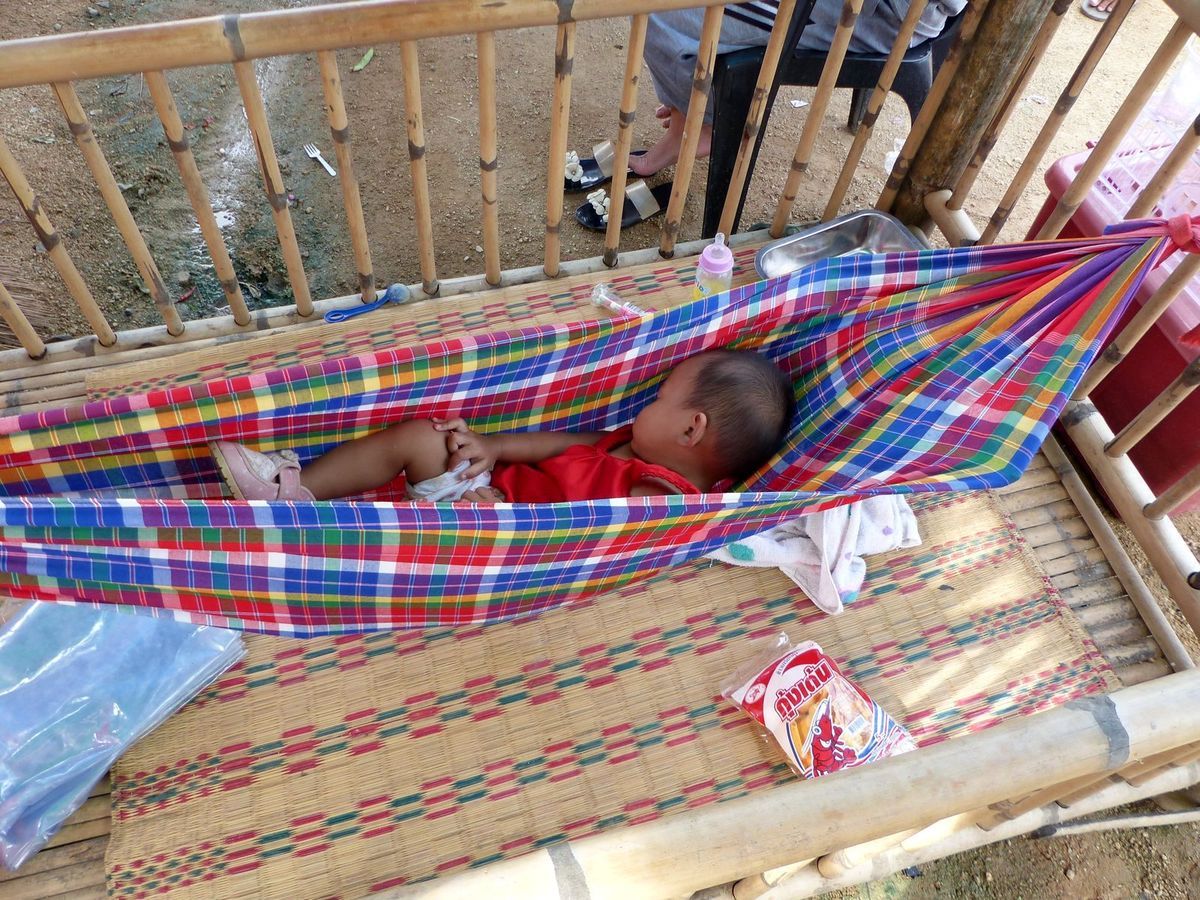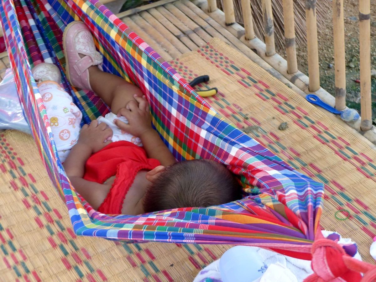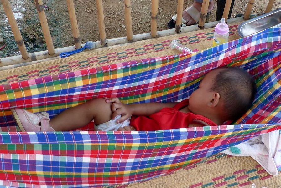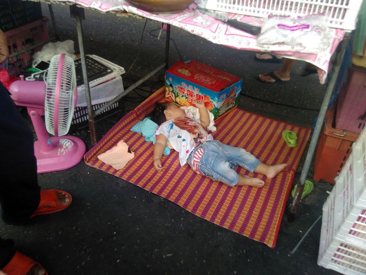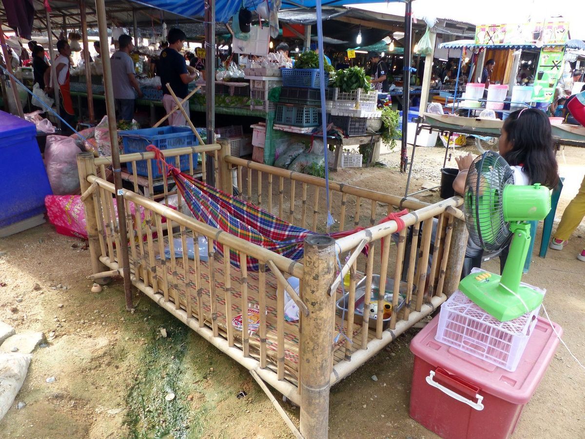En fait sur tous les marchés, il est fréquent de voir des bébés ou jeunes enfants qui accompagnent leurs parents, qui dorment auprès d'eux à même le sol ou sur un étal...