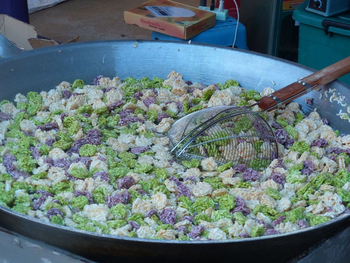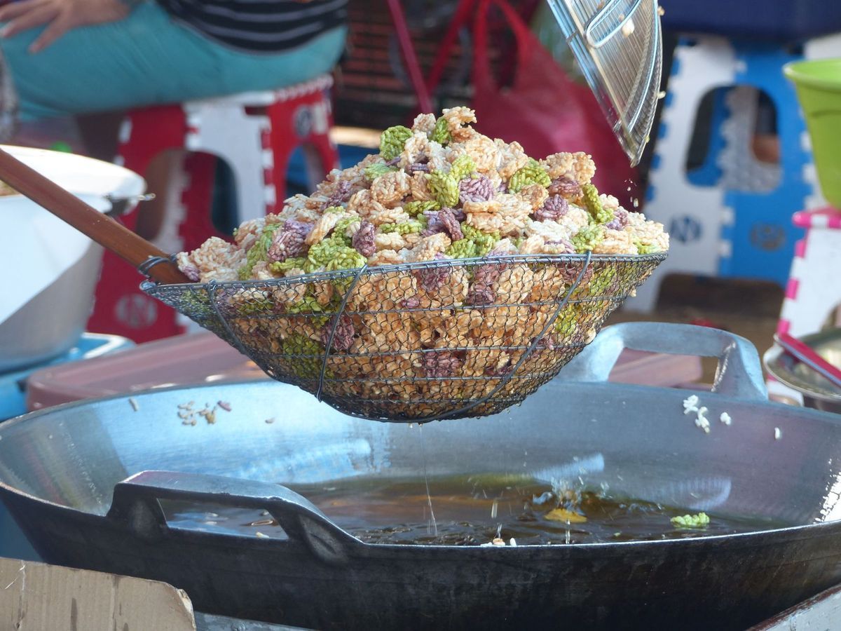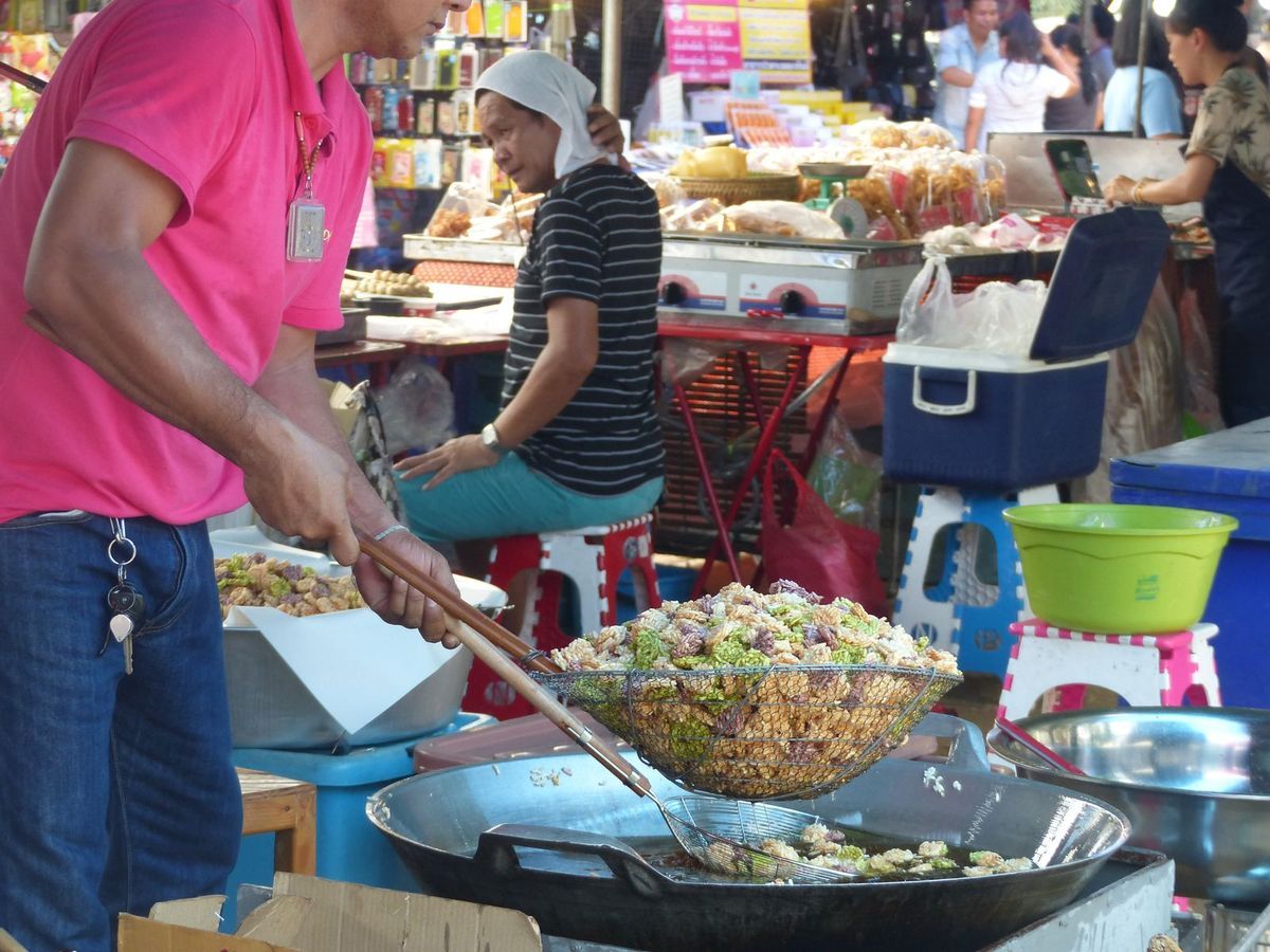 - d'un marché "à la thaïlandaise", avec (beaucoup de) nourritures à emporter ou à déguster sur place... Brochettes, plats en sauce, viandes au barbecue, biscuits, tout est cuisiné sur place bien entendu...