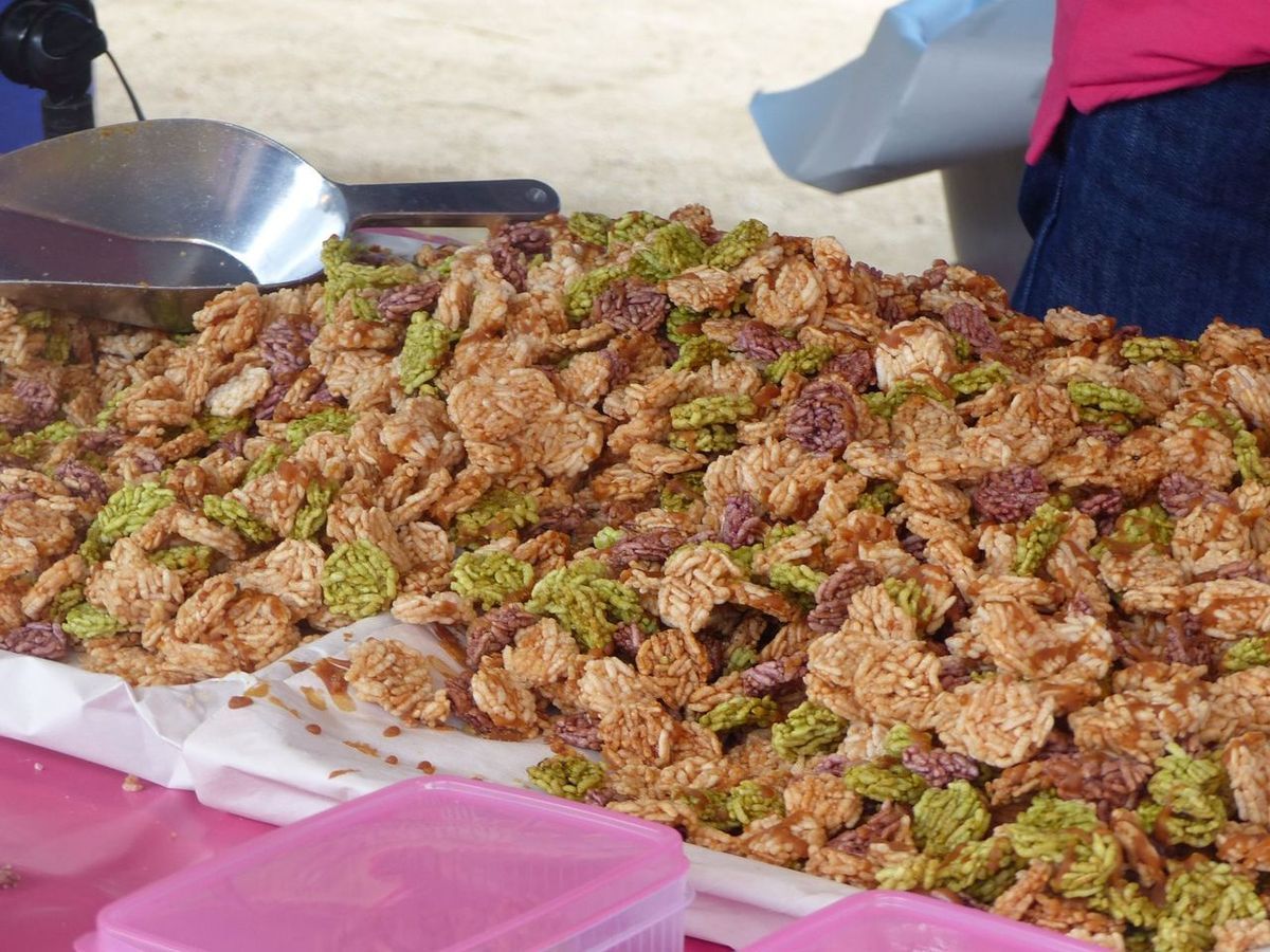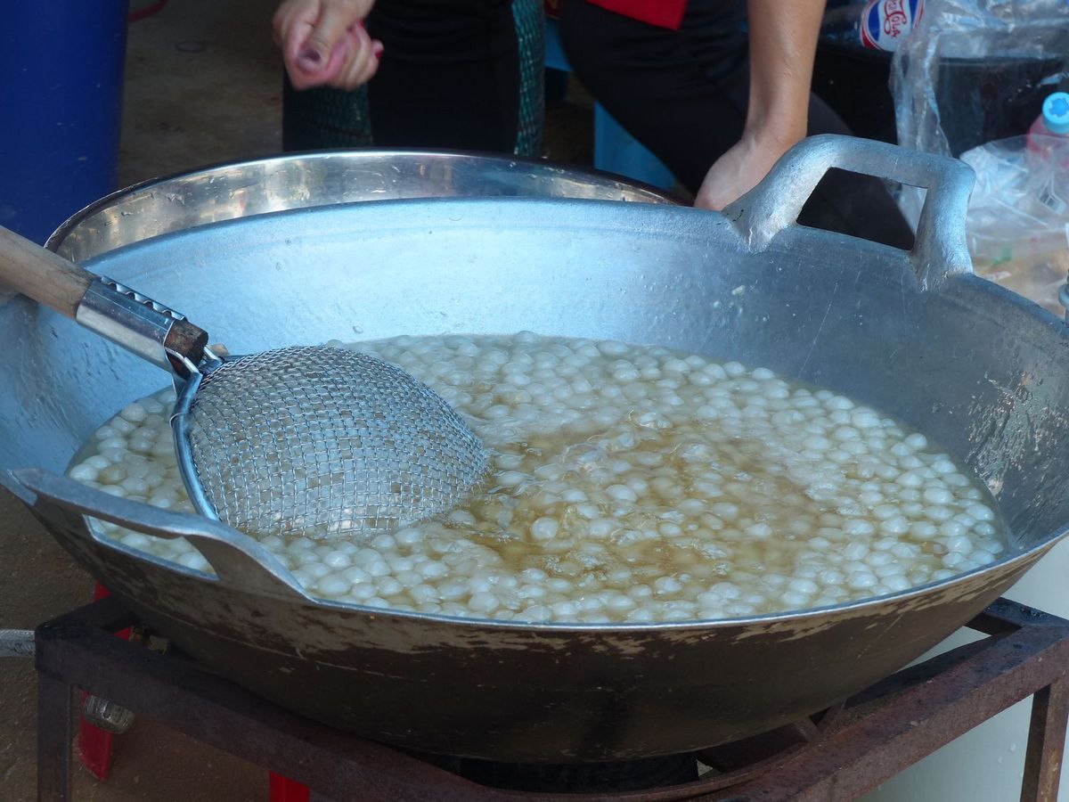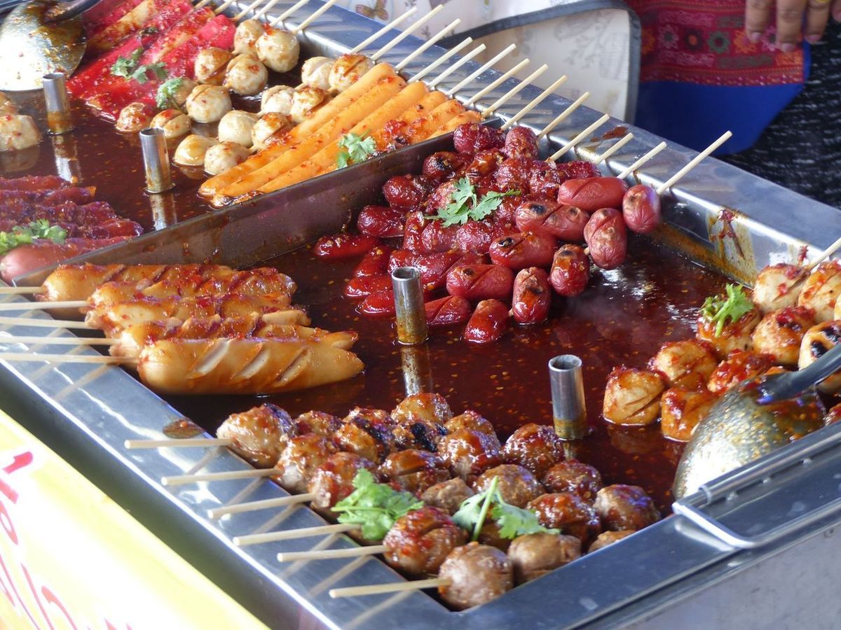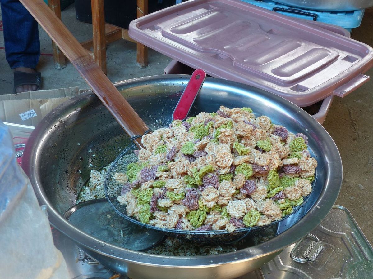 - d'un marché "à la thaïlandaise", avec (beaucoup de) nourritures à emporter ou à déguster sur place... Brochettes, plats en sauce, viandes au barbecue, biscuits, tout est cuisiné sur place bien entendu...