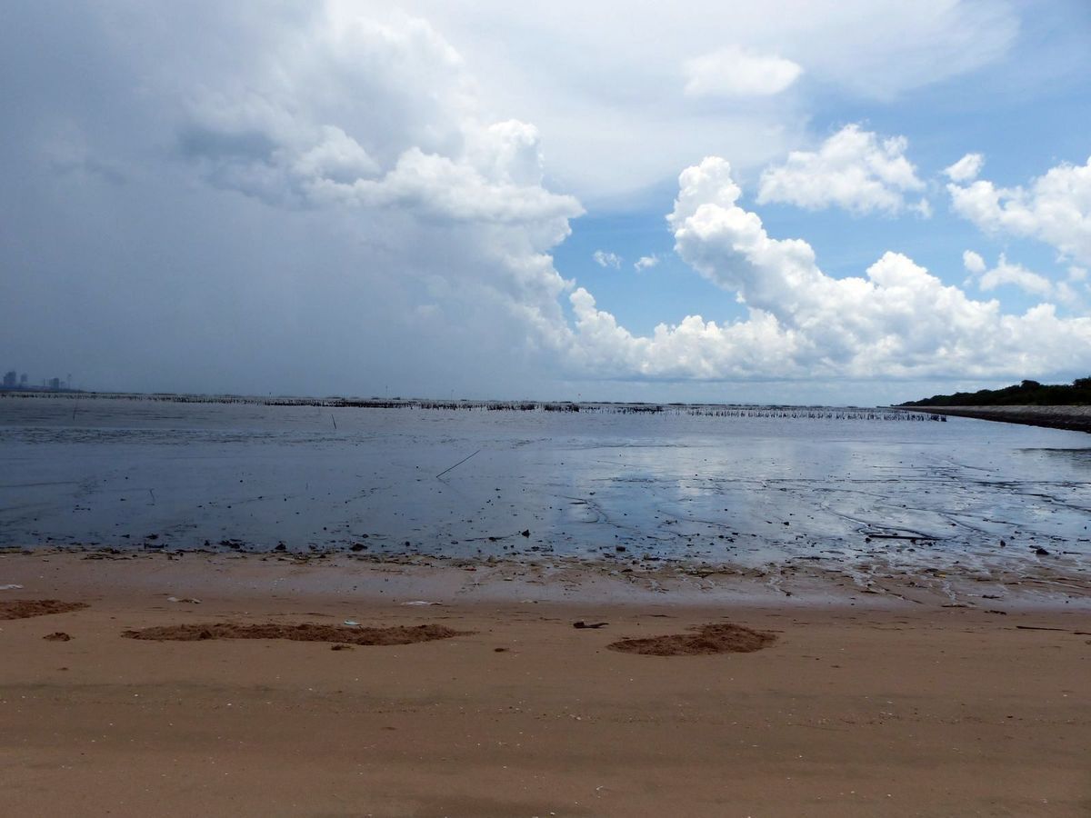 Je vous ai déjà parlé du village de pécheurs de Banglamung où nous allons assez fréquemment pour acheter des fruits de mer (voir les liens au bas de cet article). En marchant un peu plus loin, on accède à une petite plage au large de laquelle sont installés les pieux pour l’élevage des moules huîtres et autres coquillages.