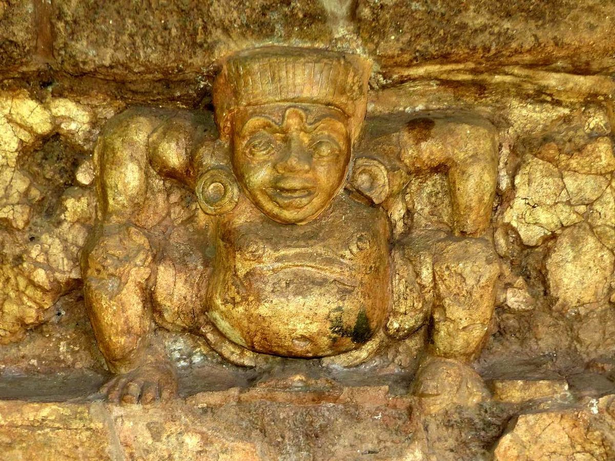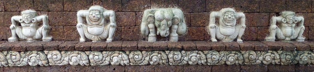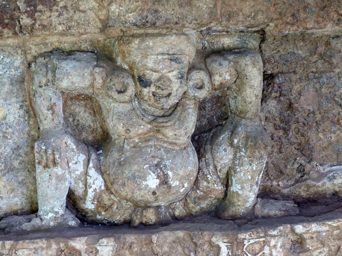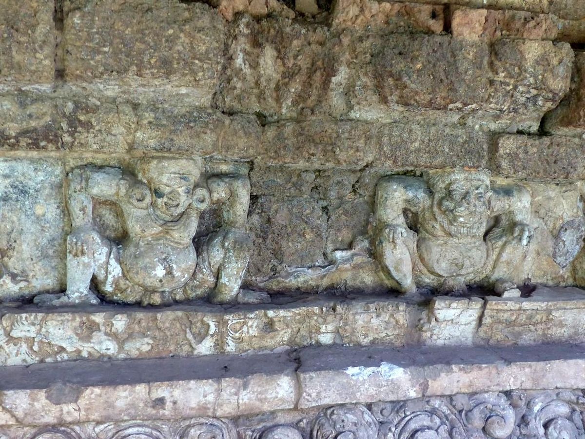 A sa base, de nombreuses sculptures (datées du 9ème siècle) représentent des nains et divers animaux (singes, lions, buffles, éléphants) dans la position de soutien du bâtiment.