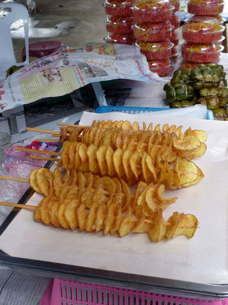 En fait les pommes de terre découpées en fines lamelles sont cuites au barbecue sur ces brochettes. Vendues comme des friandises, on en trouve en particulier à la sortie des écoles...