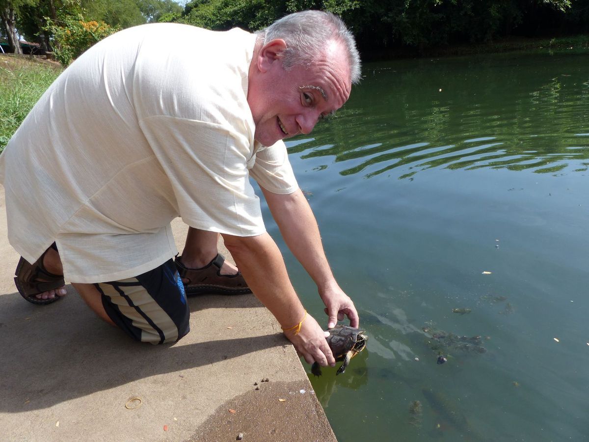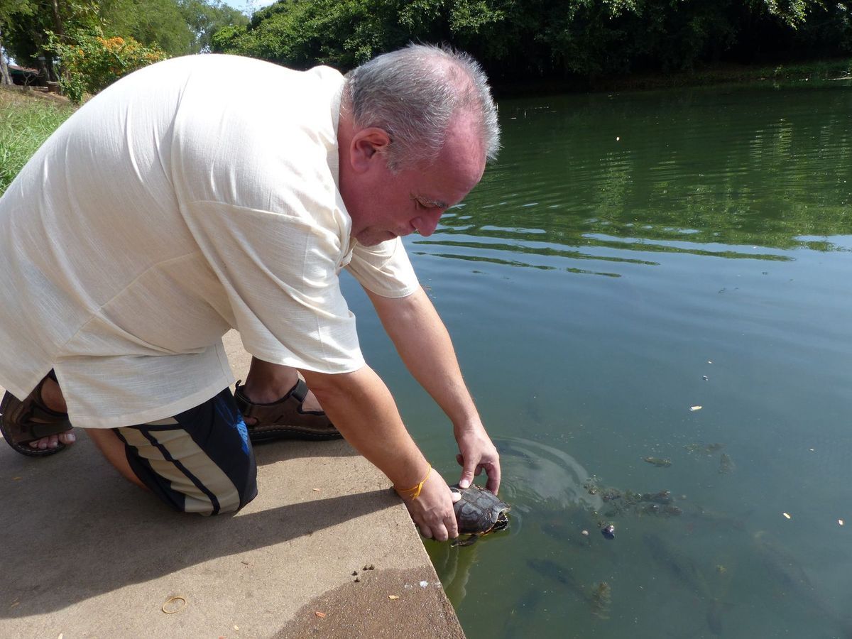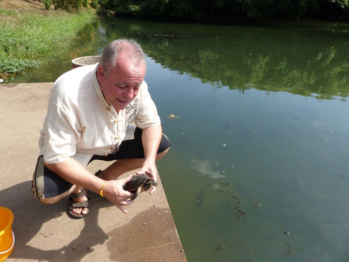 Les bienfaits attendus sont variables selon le type d'animal considéré. Nous avons choisi de remettre à l'eau une tortue, ce qui est censé nous assurer "longue vie"...