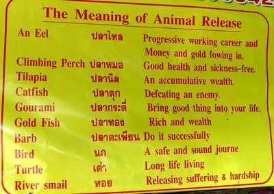 Parmi les rituels régulièrement pratiqués par les thaïs, il en est un qui consiste à "relâcher" des animaux... C’est une pratique qui remonte aux origines du Bouddhisme et qui vise à cultiver « la compassion à l’égard de tous les êtres vivants ».