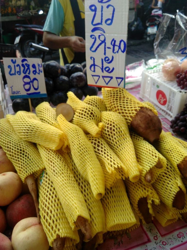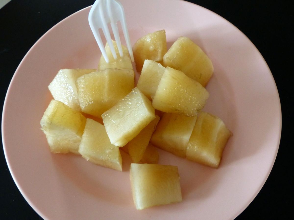 Une fois épluché,on peut déguster le "Bua Hima"comme un fruit. La texture et le goût de sa chair croquante, juteuse et sucrée est à mi-chemin entre pomme et pastèque.