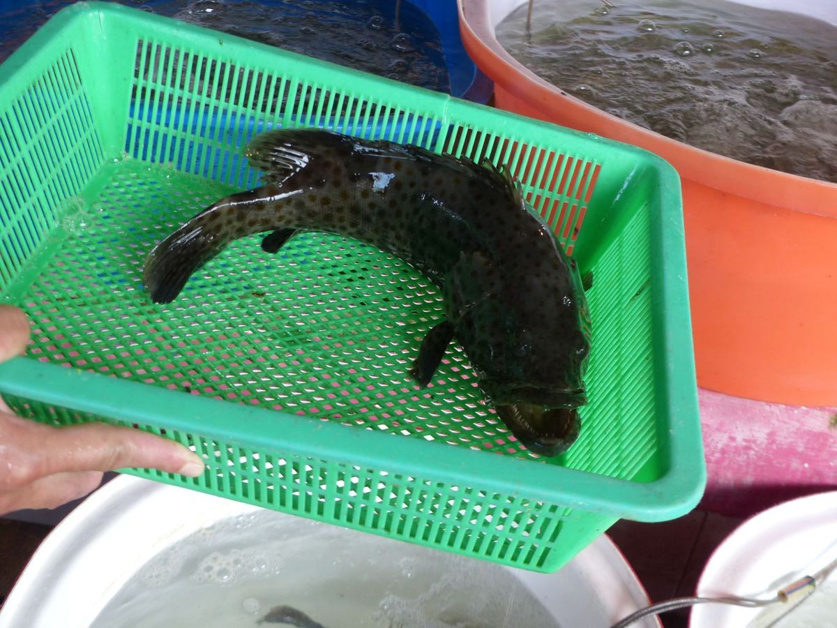 Ces poissons (ปลาเก๋า prononcez "pla kaow"), de la famille des mérous, peuvent être agressifs lorsqu'ils sont ensemble dans la même bassine. La noix de coco les apaise...