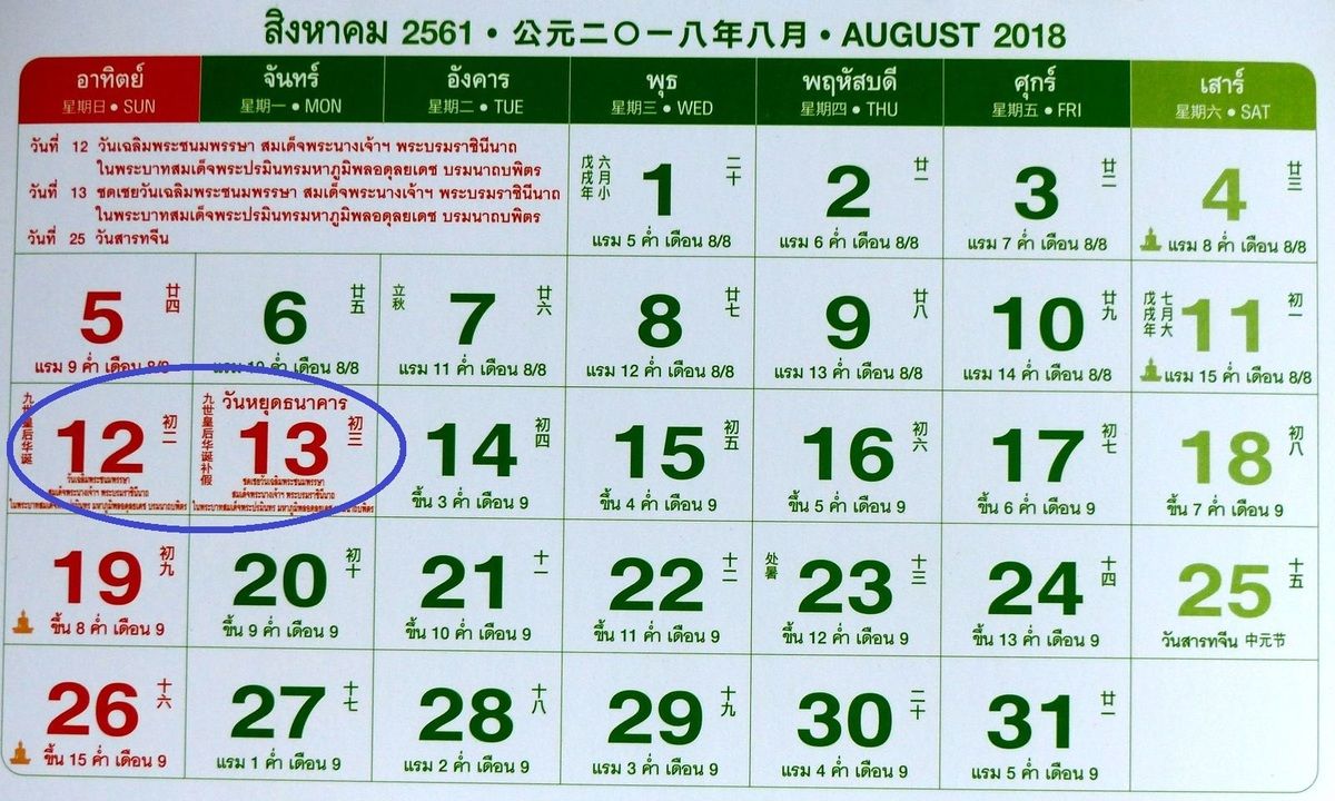 Jours fériés (18-10) - 12 aout : Fete des Mères / Anniversaire de la reine Sirikit