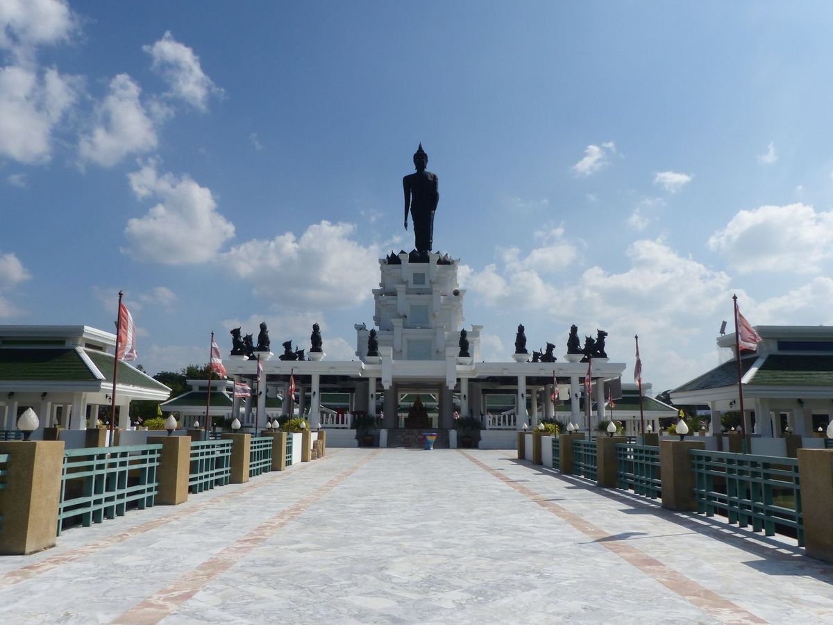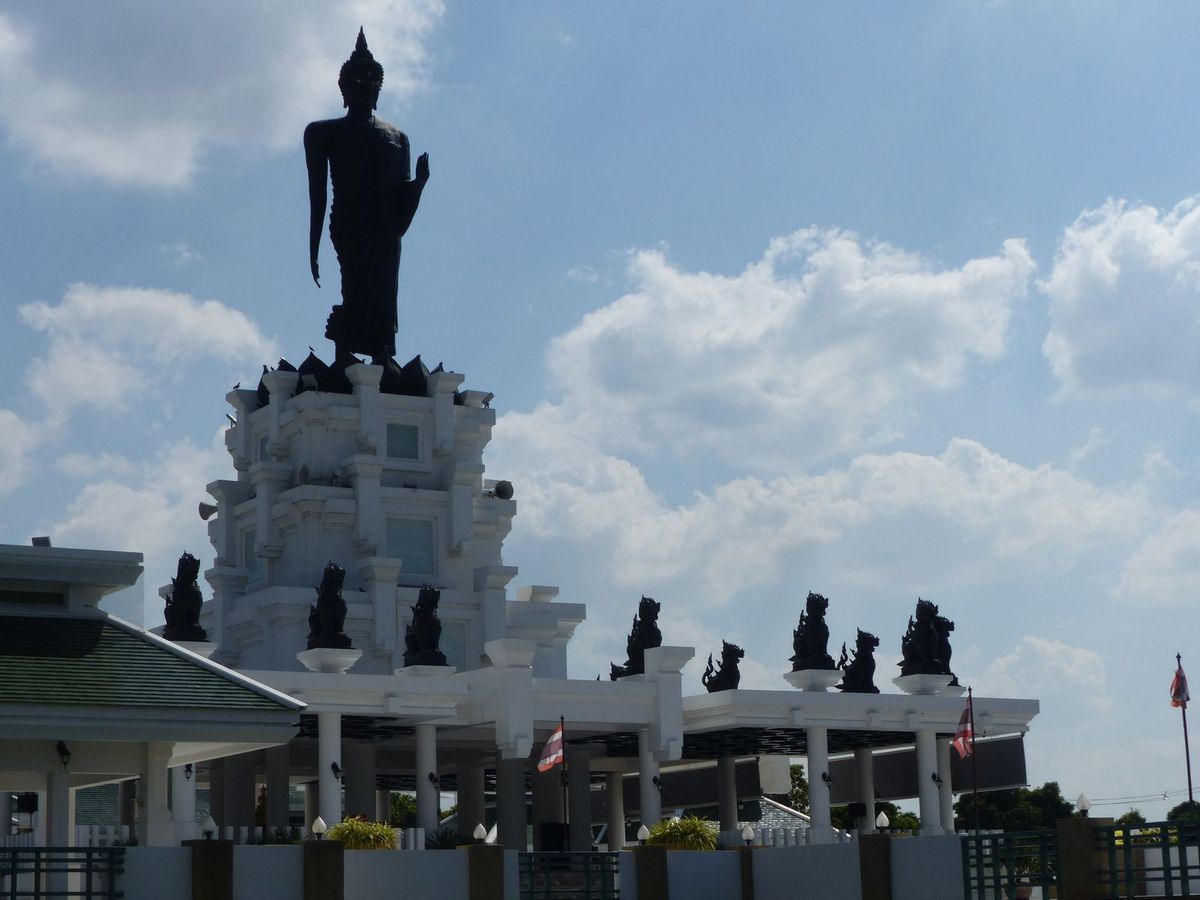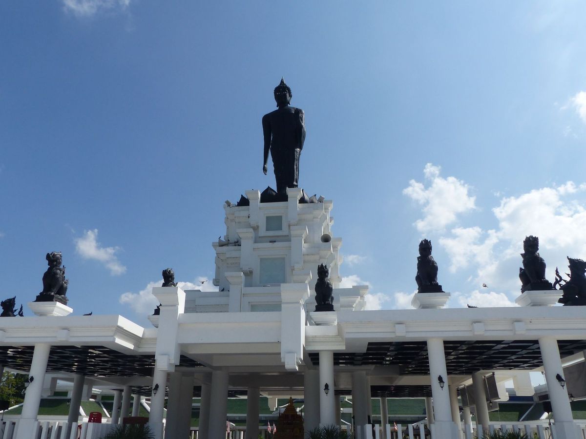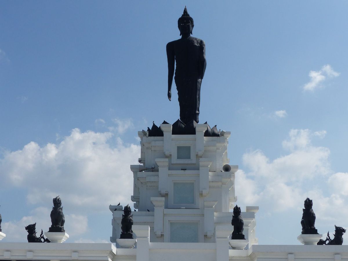Sur une grande esplanade entourée d’eau, est érigée une statue de Bouddha "en marche".