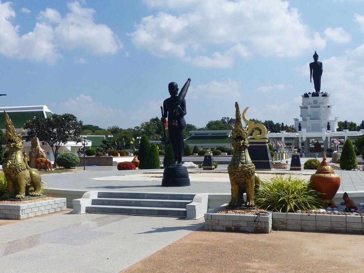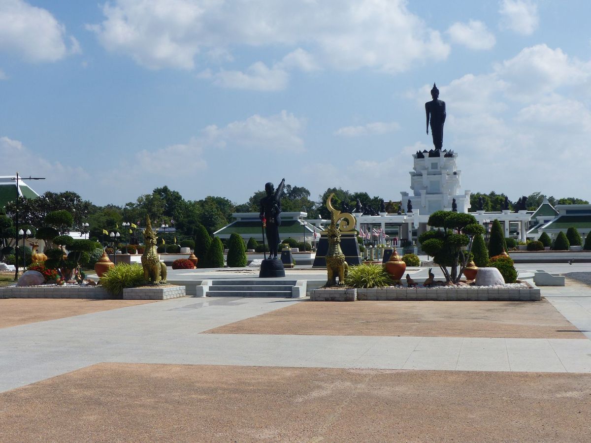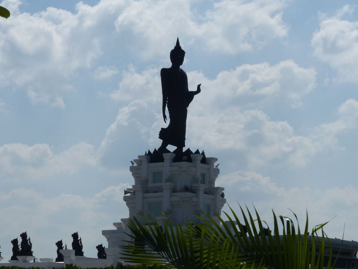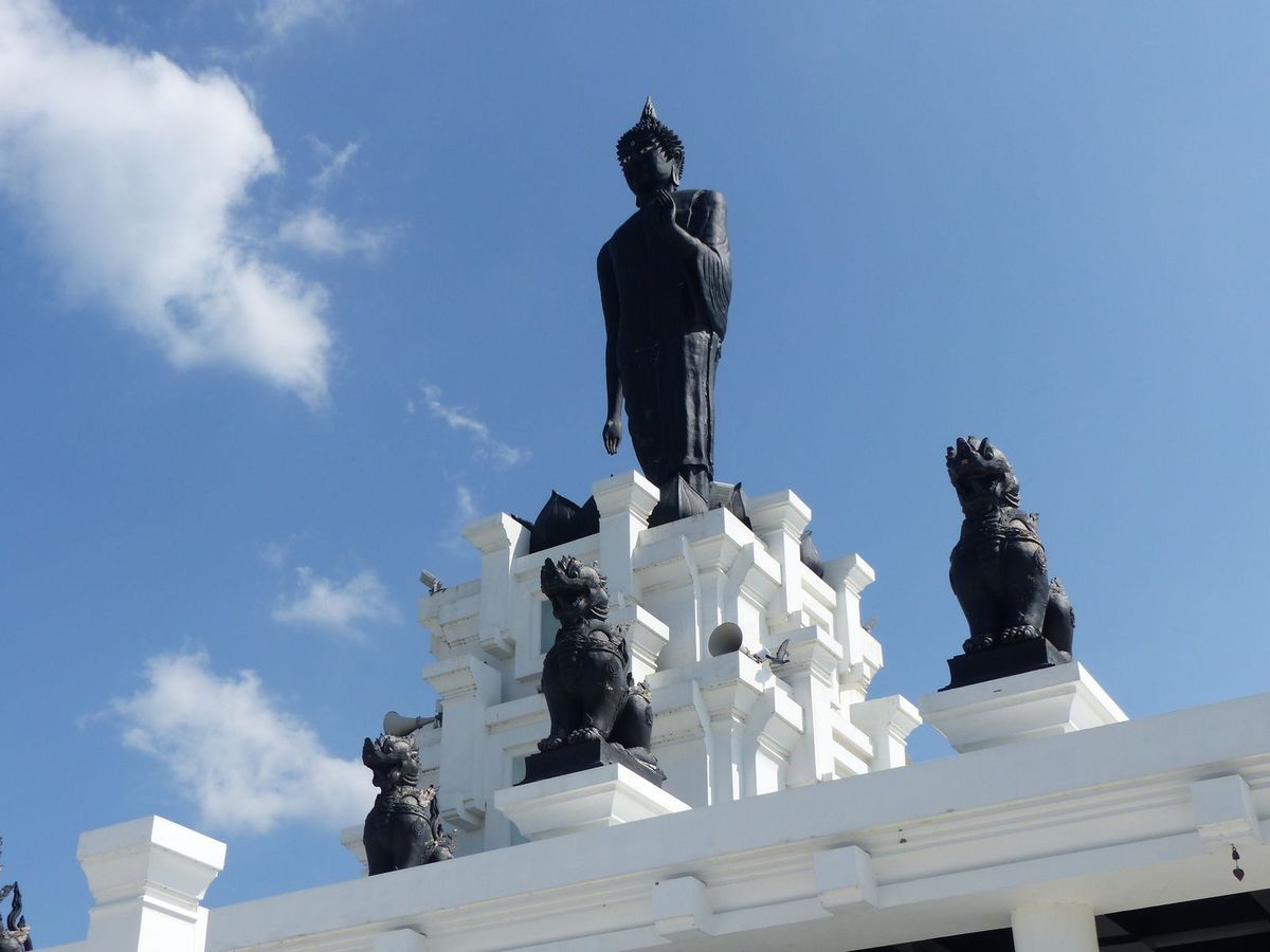 Sur une grande esplanade entourée d’eau, est érigée une statue de Bouddha "en marche".