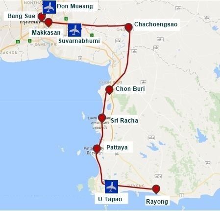 Cette ligne, longue de 220 km, desservira aussi les villes côtières industrielles (Chonburi, Laem Chabang-Si Racha) et touristiques (Pattaya, Sattahip).