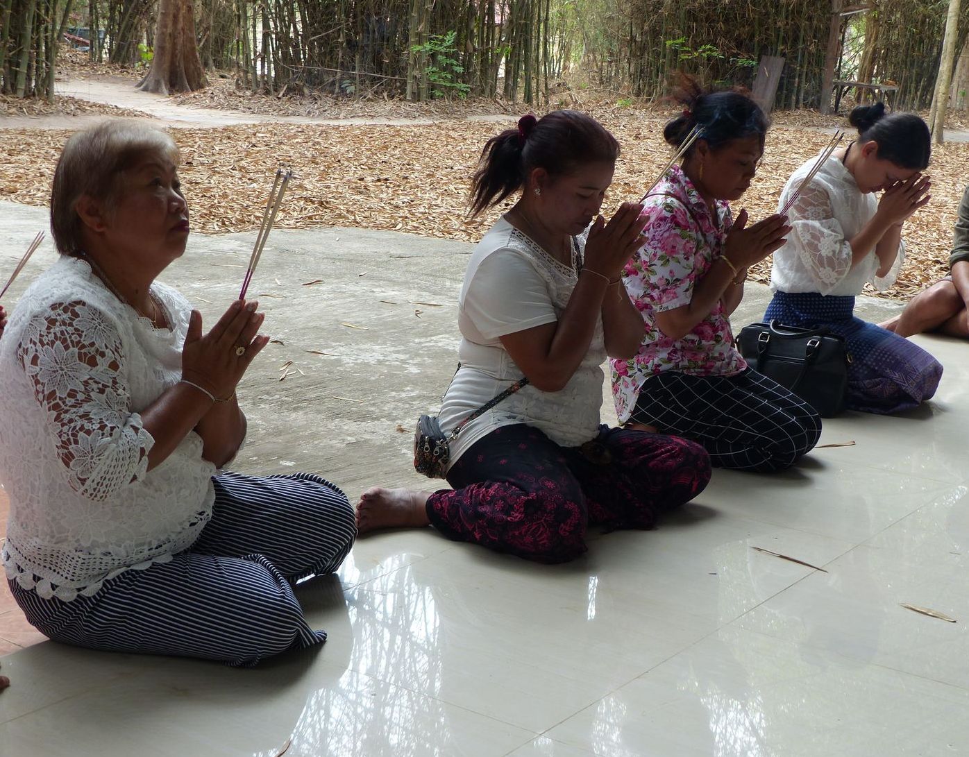 Voici l'exemple d'un recueillement en famille devant un sanctuaire installé dans une petite forêt de bambous, au milieu des rizières.