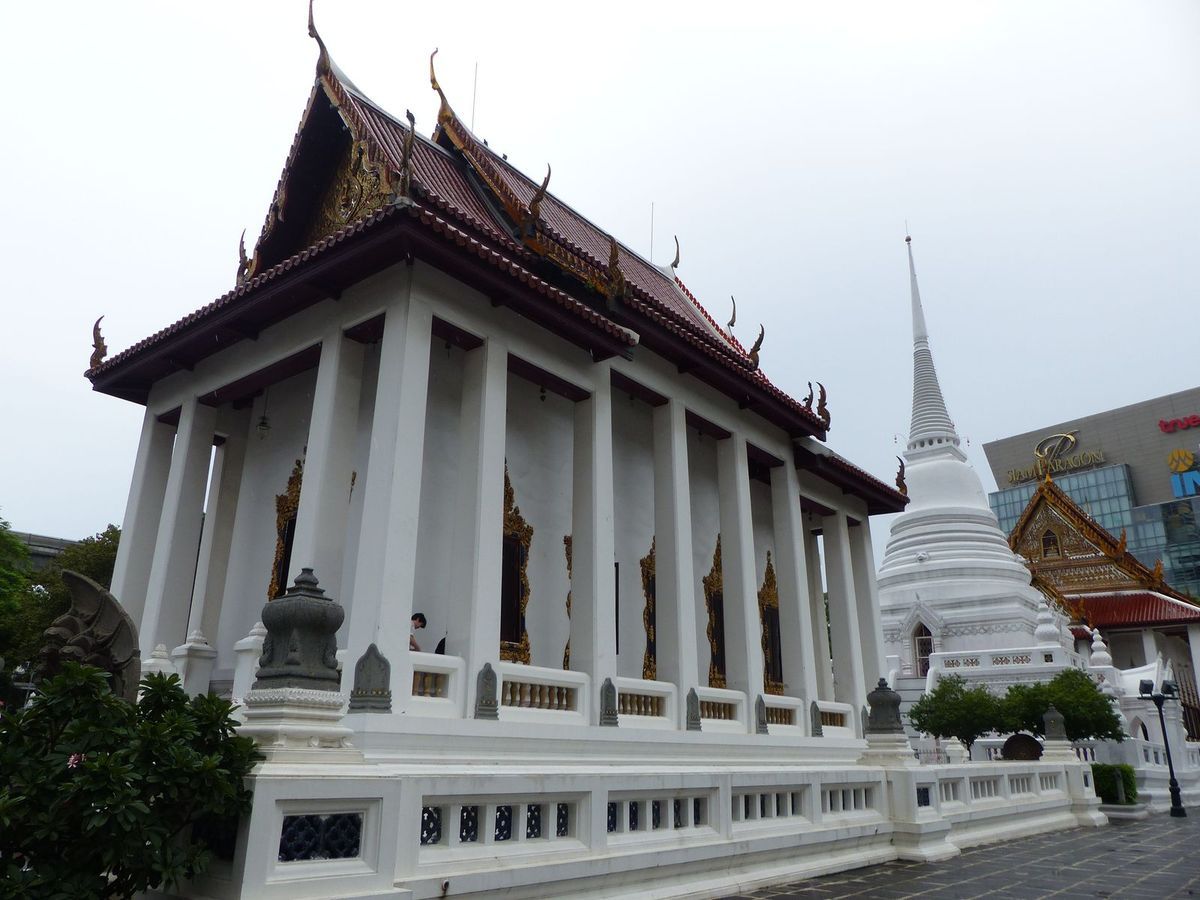 Le temple est littéralement intercalé entre Siam Paragon et Central World, deux des plus grands centres commerciaux de Bangkok, sortes de monuments dédiés au shopping et aux loisirs du 21ème siècle.