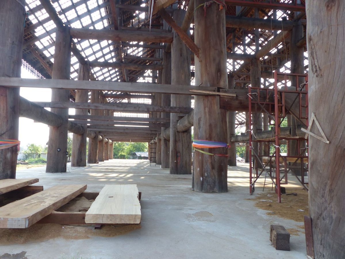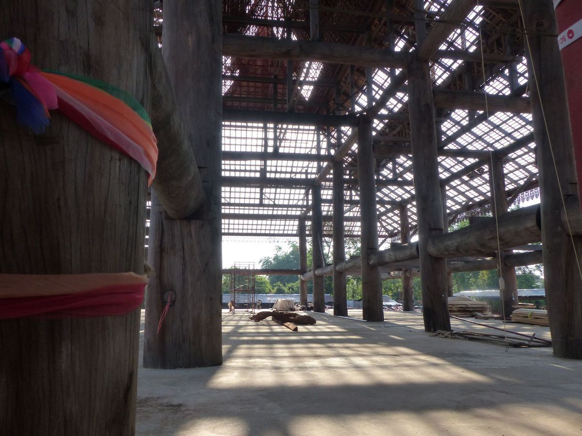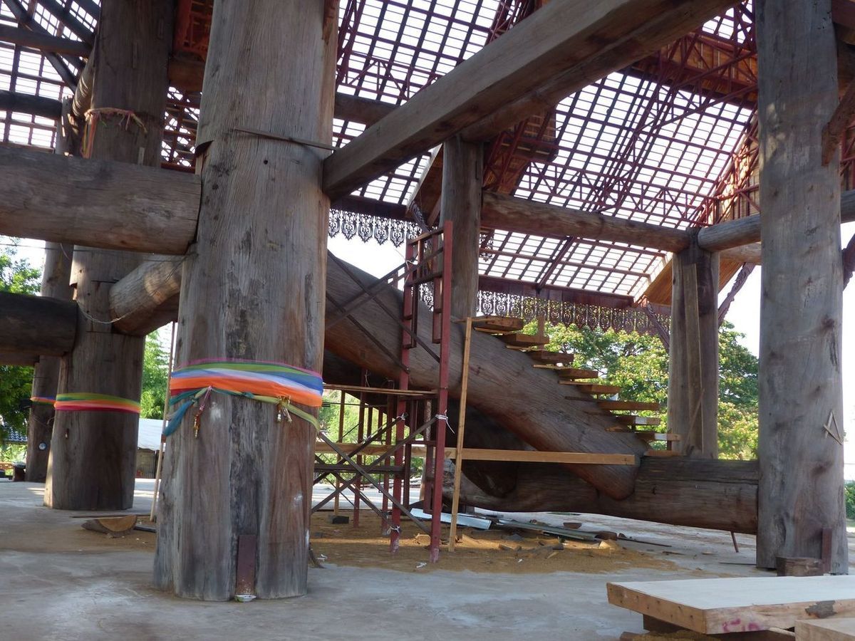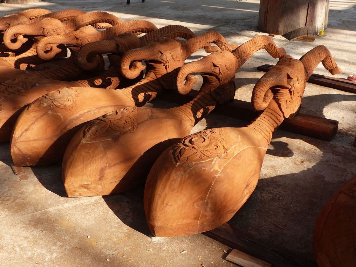 Bien que le gros-oeuvre ne soit pas terminé, certaines décorations de bois sculpté sont déjà en place, d'autres représentant des têtes d'éléphants, étaient prêtes à être installées.
