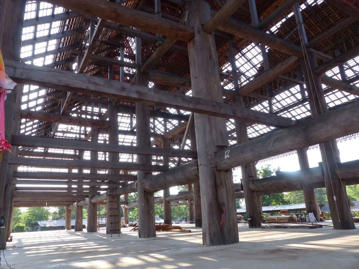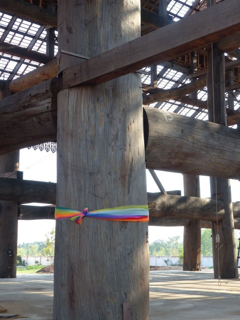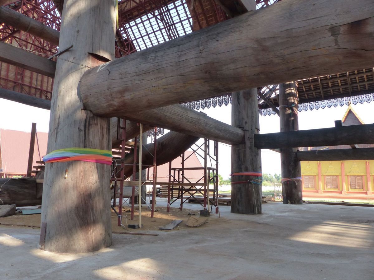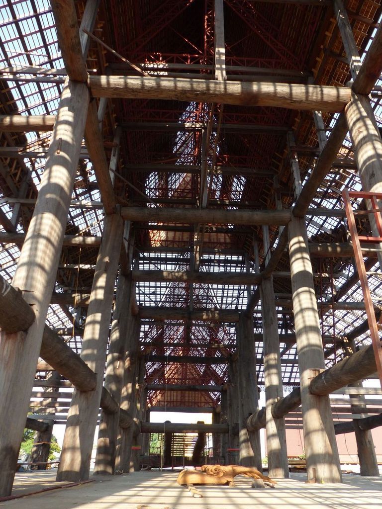Bien que le gros-oeuvre ne soit pas terminé, certaines décorations de bois sculpté sont déjà en place, d'autres représentant des têtes d'éléphants, étaient prêtes à être installées.