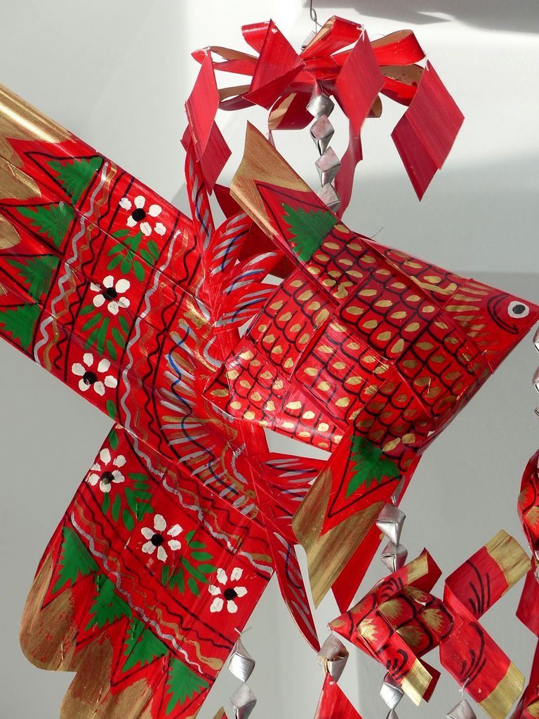 Après avoir été séchées et découpées les feuilles sont pliées, tissées, assemblées pour obtenir la forme des poissons.