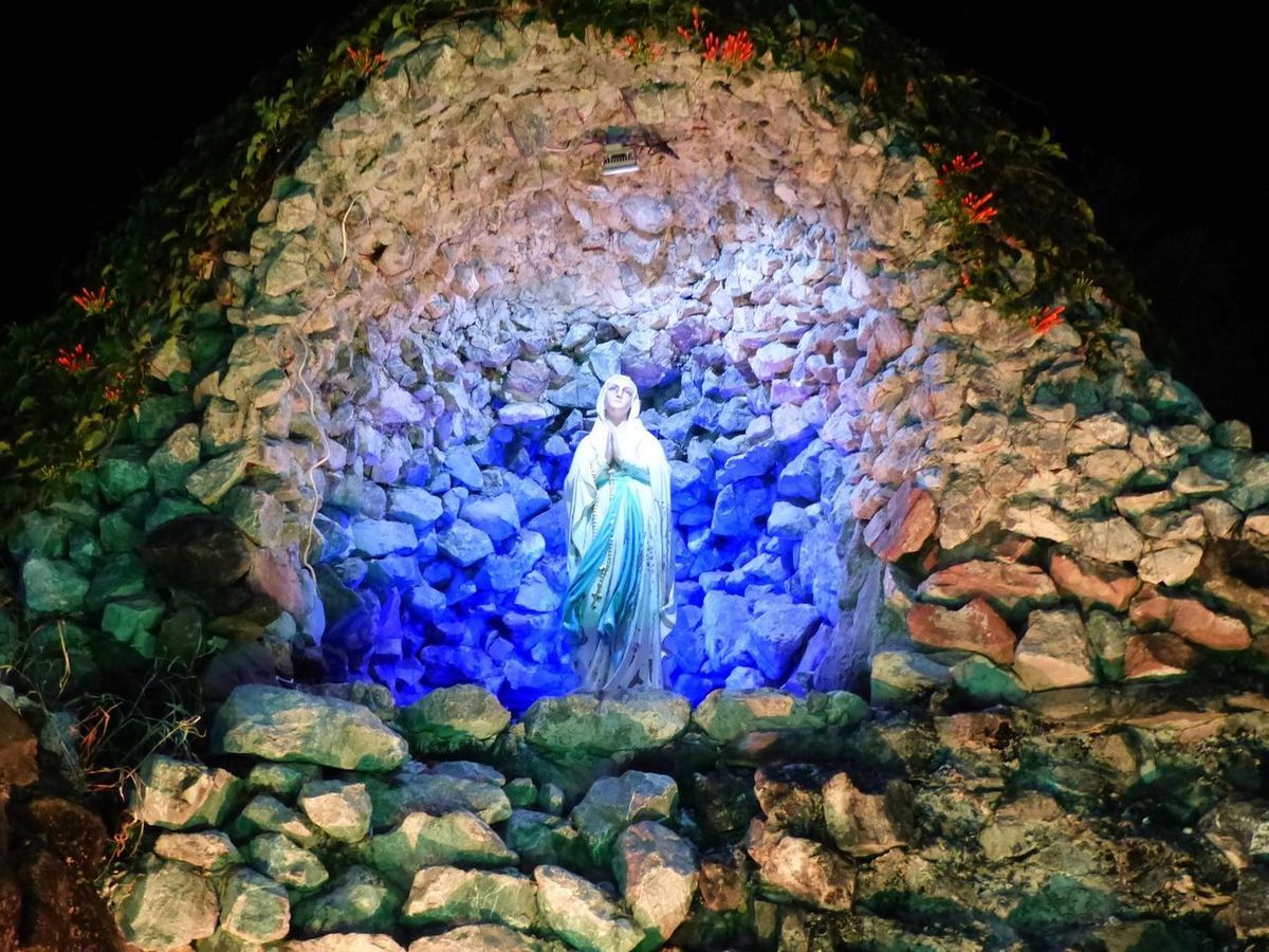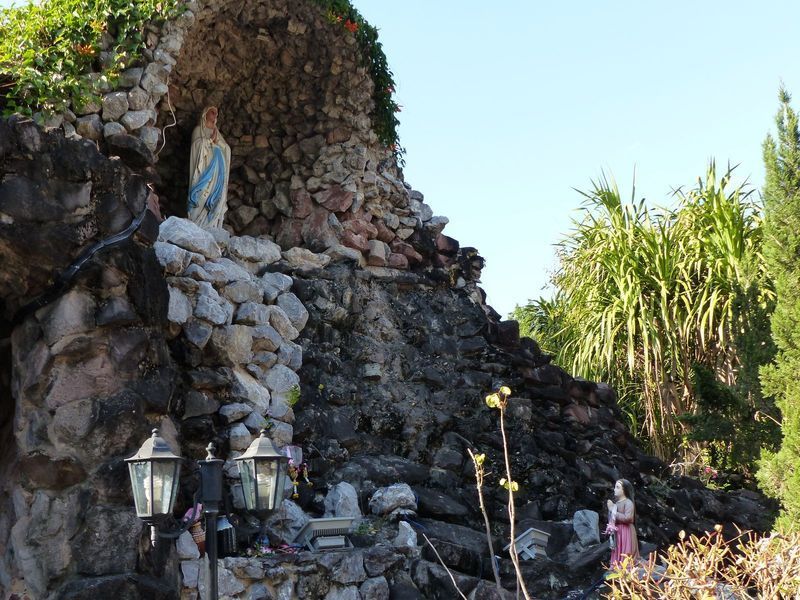 Dans le jardin sont exposées des statues modernes, une représentation sommaire de la grotte de Lourdes et plusieurs décorations spécifiques pour Noël.